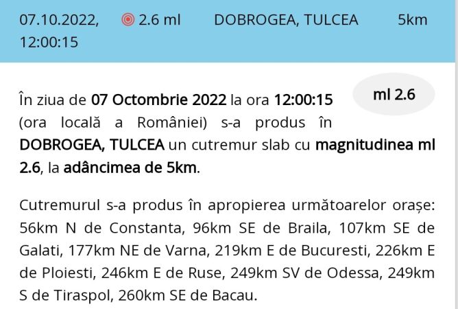 Cutremur în România cu magnitudinea ml 2.6, la adâncimea de 5km, în ziua de 7 octombrie, la ora 12:00:15 (ora locală a României), în Dobrogea, Tulcea