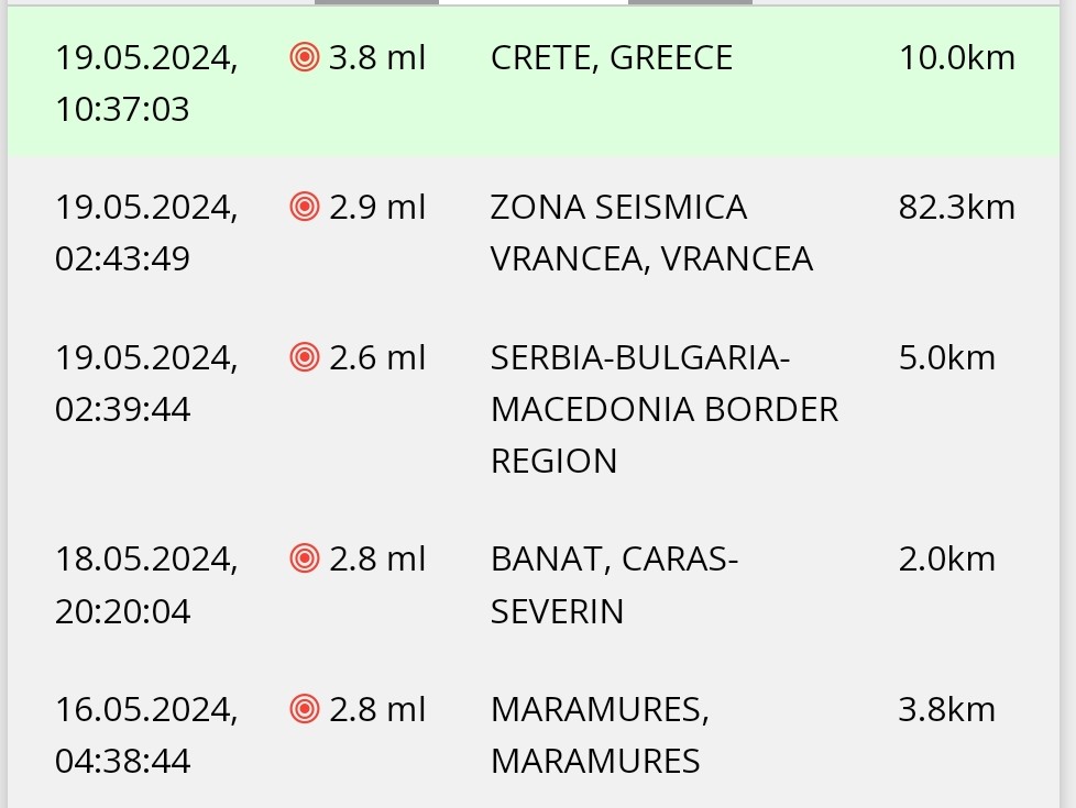 În ziua de 19 Mai 2024 la ora 02:43:49 (ora locală a României) s-a produs în ZONA SEISMICA VRANCEA, VRANCEA un cutremur slab cu magnitudinea ml 2.9, la adâncimea de 82.3km.