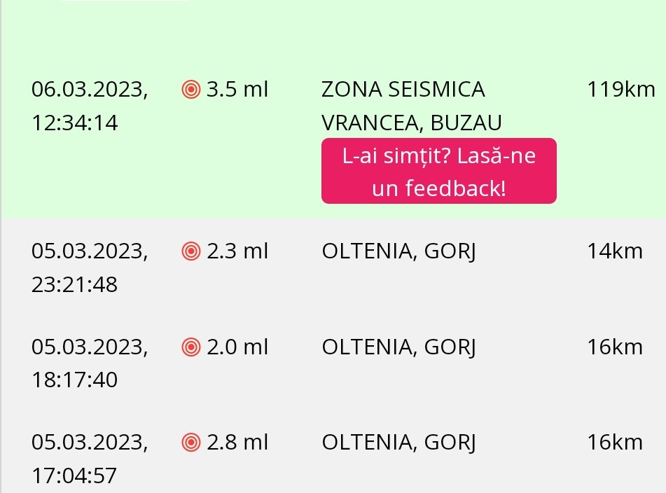 Cutremur în zona Vrancea, în ziua de 06 Martie 2023, la ora 12:34:14 (ora locală a României), s-a produs în ZONA SEISMICA VRANCEA, BUZAU un seism cu magnitudinea ml 3.5, la adâncimea de 119km.