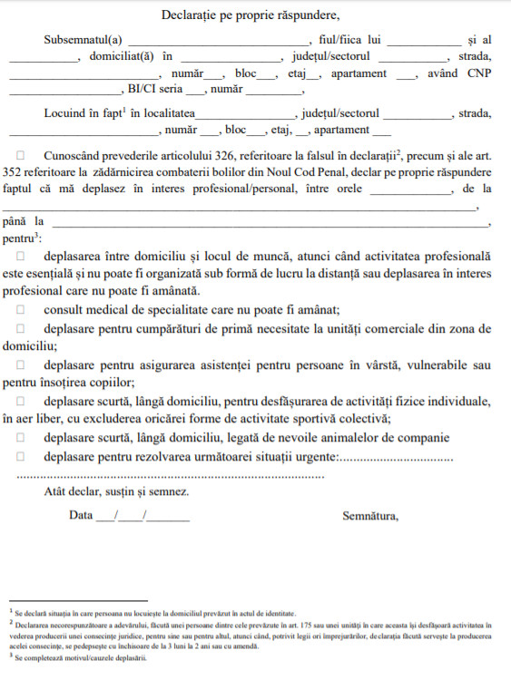 Declarația pe proprie răspundere completată se va afla în posesia persoanei care efectuează deplasarea, împreună cu documentul de identitate, și va fi pusă la dispoziția reprezentanților Poliției Române, ai Jandarmeriei sau ai Poliției Locale la momentul legitimării persoanei.