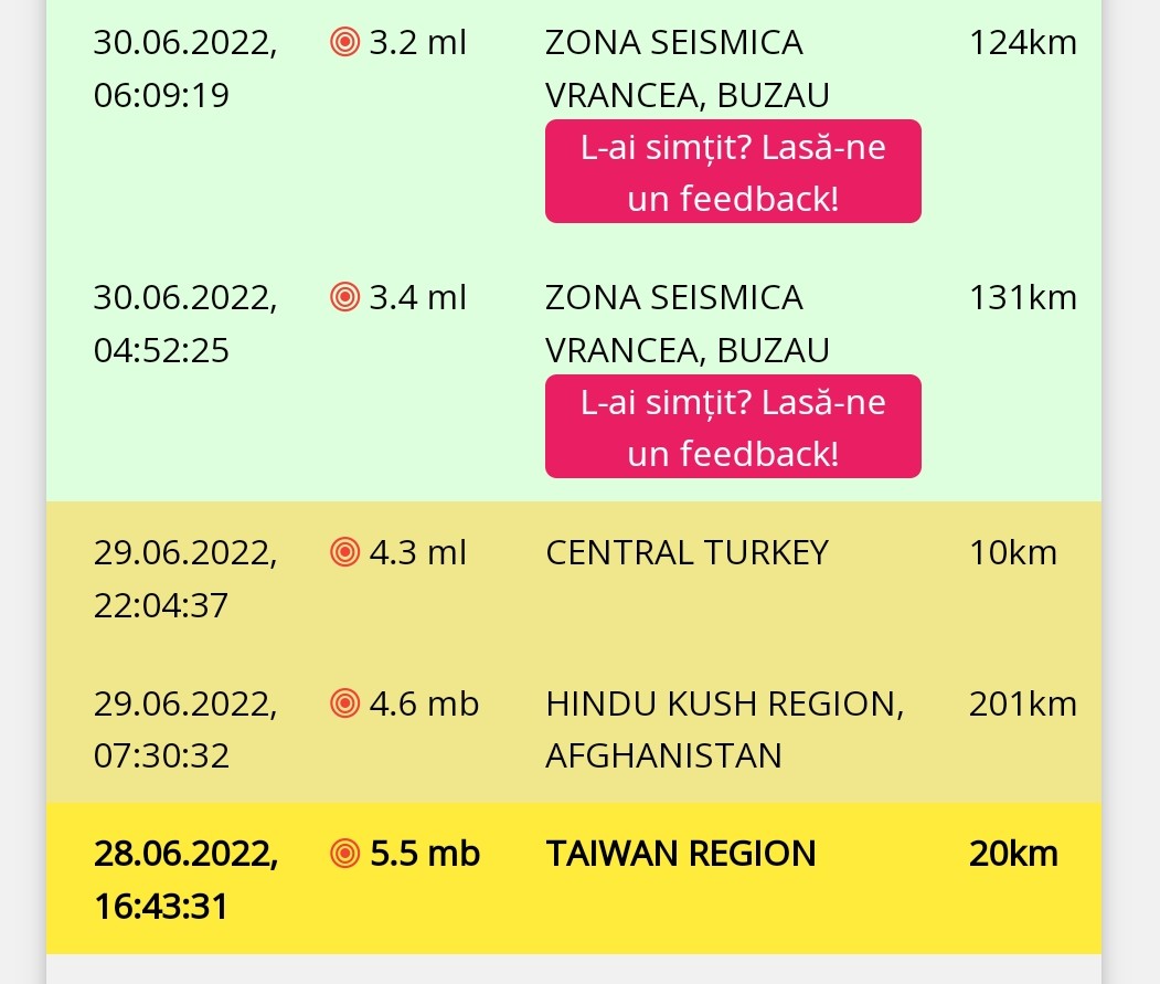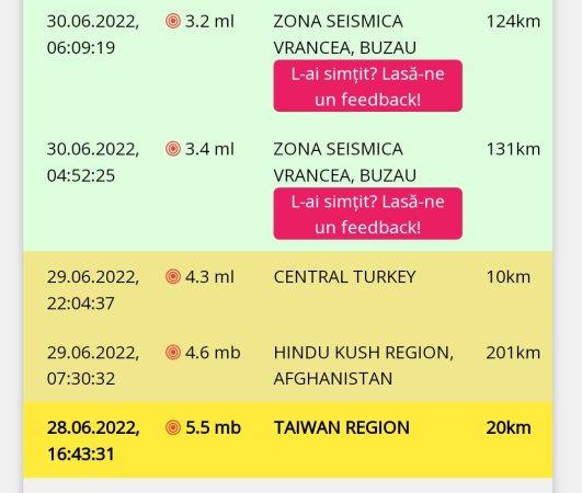 Cel de -al doilea seism, în ziua de 30 Iunie 2022 la ora 06:09:19 (ora locală a României) s-a produs în ZONA SEISMICA VRANCEA, BUZAU un cutremur slab cu magnitudinea ml 3.2, la adâncimea de 124km.