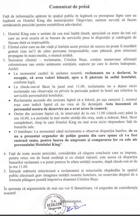 Hotel King lămureşte situaţia furtului din camerăhotel king