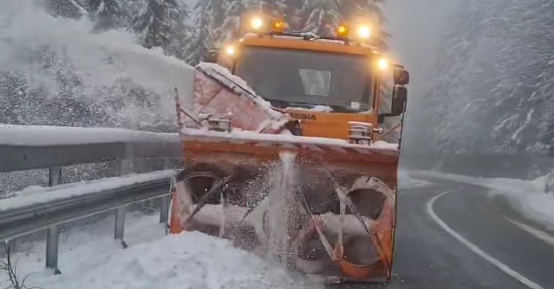 Iarnă autentică la Mălaia, pe DN 7A și ploi torențiale și viitură pe DN 66, Defileul Jiului, în această după-amiază utilajele de deszăpezire interveneau în forta pe DN 7A pentru îndepărtare zăpadă din zona parapetelui cu ajutorul autofrezei.