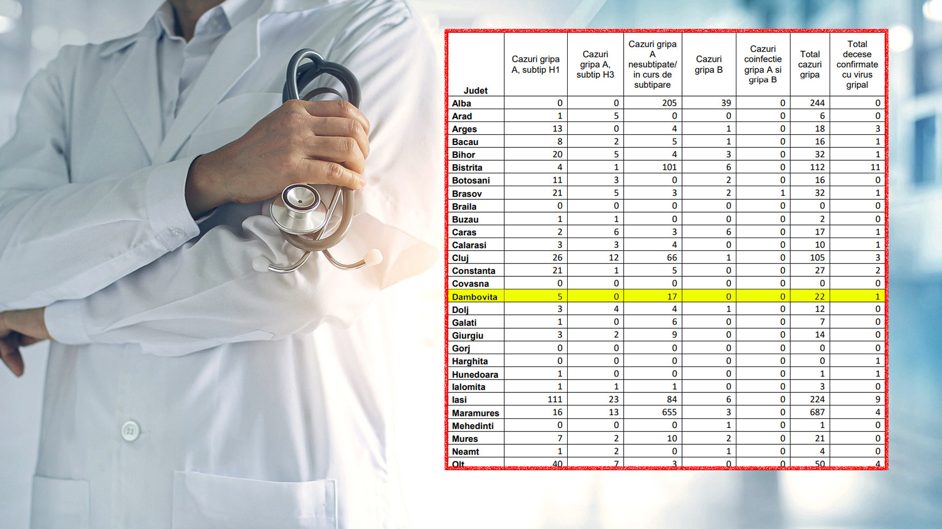 În județul Dâmbovița, 22 de cazuri de gripă și un deces potrivit datelor oficiale de la INSP din 23 februarie 2023, se menține o răspândire geografică extinsă, dar cu o intensitatemedie a activității gripale.