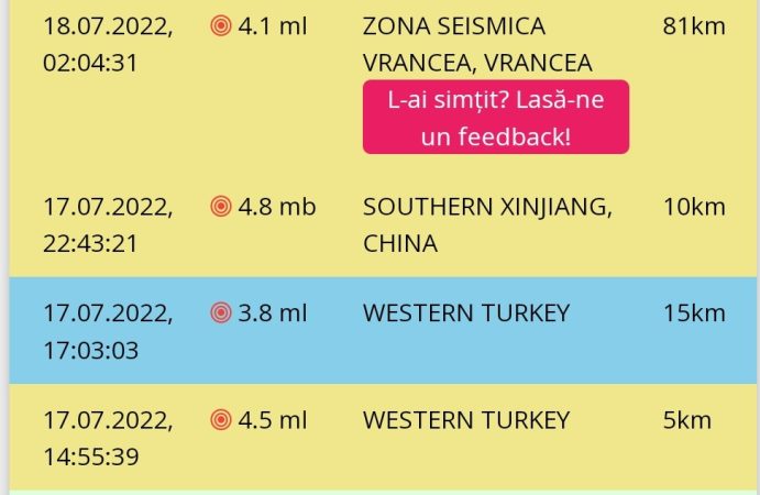 În noaptea de luni, 18 iulie, cutremur cu magnitudinea 4.1, în Vrancea, la adâncimea de 81km, la ora 02:04:31, ora locală a României.