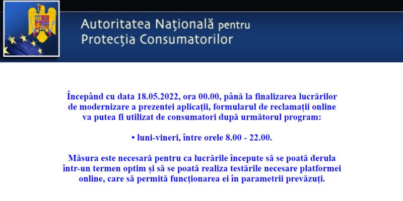Deși lucrările nu sunt încă finalizate, începând de la data 18.05.2022, ora 0.00, până la finalizarea acestor lucrări, formularul de reclamații online, disponibil pe site-ul www.anpc.gov.ro, va putea fi utilizat de consumatori după următorul program: de luni-vineri, între orele 8.00-22.00.