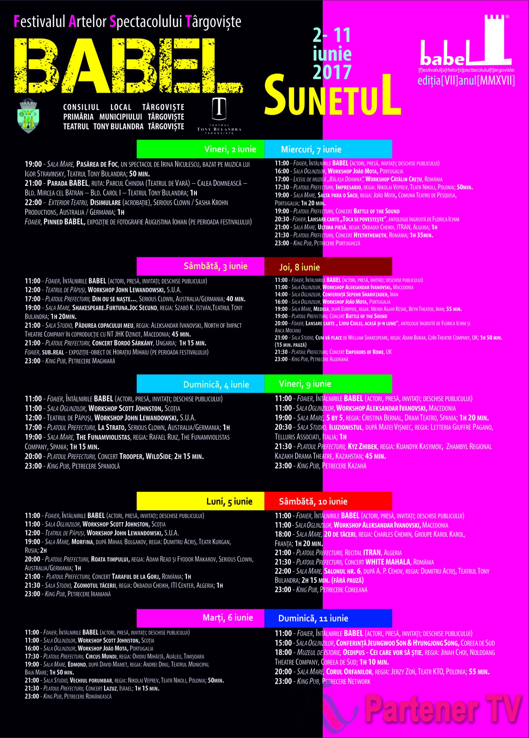 Babelul începe cu un spectacol care face legătura între două lumi: lumea copilăriei și cea a așa-zișilor oameni mari: Pasărea de foc, o producție bazată pe muzica lui Igor Stravinsky.Toți spectatorii din Sala Mare sunt invitați apoi în stradă, începând cu orele 21:00, la Parada Babel, o explozie de sunet și culoare care pornește din Parcul Chindia, din zona Teatrului de Vară, și va ajunge la Teatru, străbătând Calea Domnească, Bulevardul Mircea cel Bătrân și Carol I.