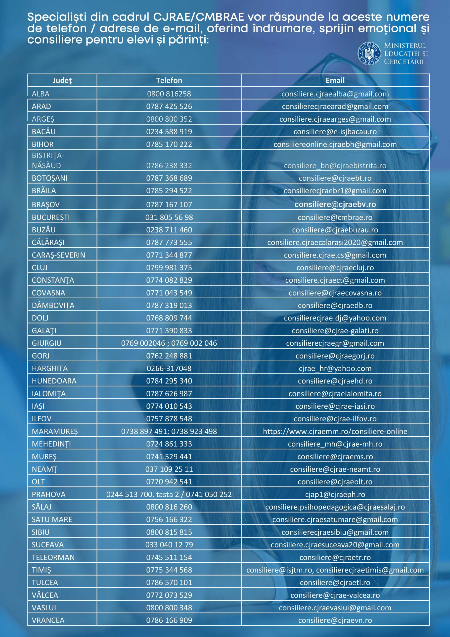 ► Liniile telefonice și adresele de e-mail alocate în acest sens, la nivelul fiecărui inspectorat școlar/Inspectoratului Școlar al Municipiului București, sunt disponibile mai jos.