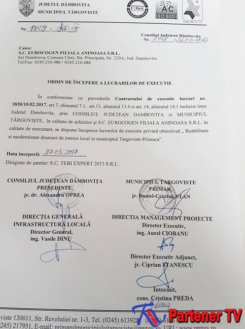 Firma constructoare este din Aninoasa: “ Am semnat astazi si ordinul de incepere a lucrarilor pentru unul dintre proiectele esentiale ale municipiului Targoviste, respectiv proiectul care vizeaza reabilitarea si modernizarea drumurilor de interes local din Priseaca.