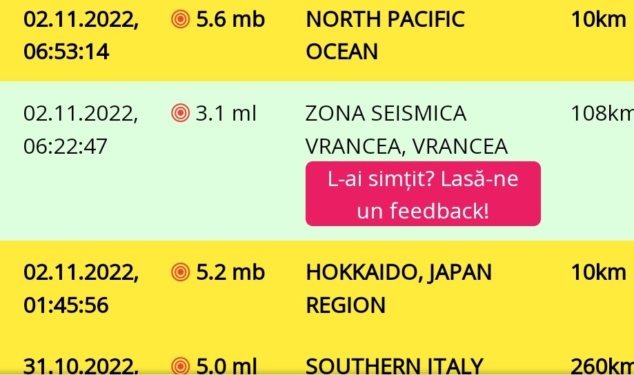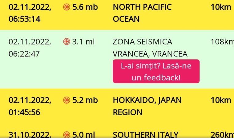 Miercuri, 2 noiembrie 2022, cutremur în România, în n ziua de 02 Noiembrie 2022 la ora 06:22:47 (ora locală a României) s-a produs în ZONA SEISMICA VRANCEA, VRANCEA un cutremur slab cu magnitudinea ml 3.1, la adâncimea de 108km.