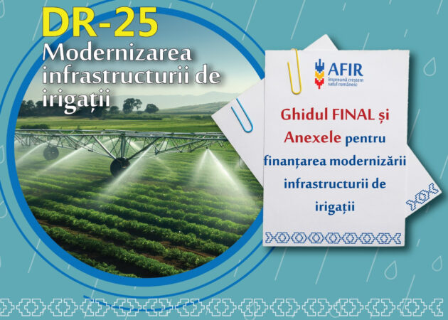AFIR a publicat pe www.afir.ro versiunea finală a Ghidului solicitantului pentru DR-25 Modernizarea infrastructurii de irigații, intervenție finanțată prin Planul Strategic pentru Politica Agricolă Comună 2023 – 2027 (PS PAC 2027).
