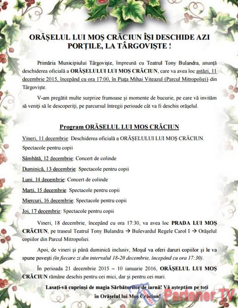 Primăria Municipiului Târgovişte, împreună cu Teatrul Tony Bulandra, anunţă deschiderea oficială a ORĂȘELULUI LUI MOŞ CRĂCIUN, care va avea loc astăzi, 11 decembrie 2015, începând cu ora 17:00, în Piaţa Mihai Viteazul (Parcul Mitropoliei) din Târgovişte.
