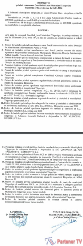 Se convoacă Consiliul Local Municipal Târgovişte, în şedinţă ordinară, în ziua de 26 ianuarie 2016, orele 14:00