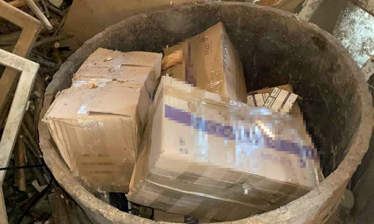 Peste 15.000 de pachete cu țigări de contrabandă, descoperite ascunse în fân, în butoaie de lemn, în spatele unui perete fals din rigips și în magazia cu lemne.