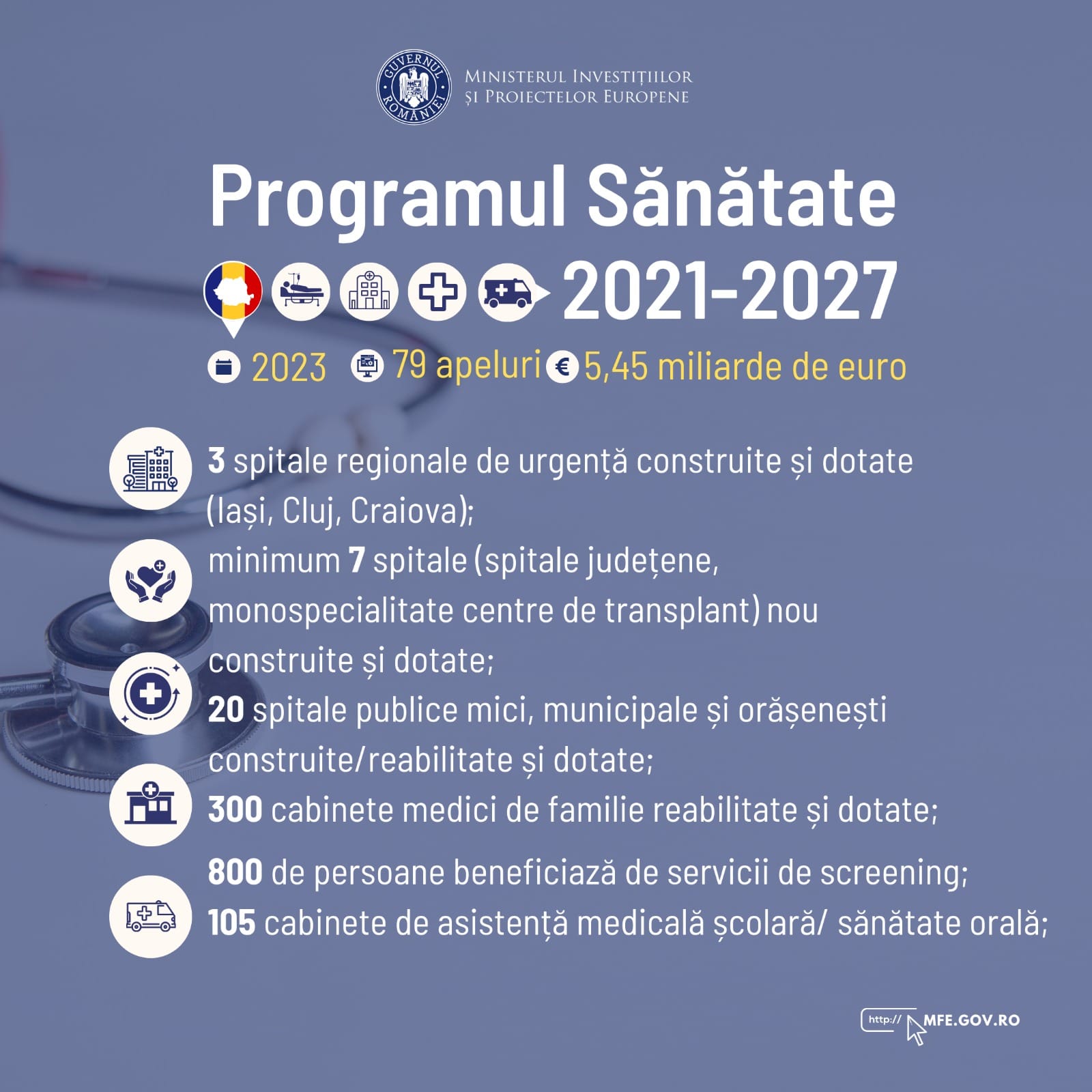 Peste 800.000 de persoane vor beneficia de servicii de screening, în 2023, prin Programul Sănătate vor fi deschise 79 de apeluri în valoare totală de 5,45 miliarde de euro pentru investiții în infrastructura de sănătate, servicii de screening, medicină de familie și medicină școlară etc.