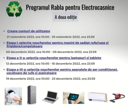Programul Rabla pentru Electrocasnice, luni, 21 noiembrie 2022, ora 10:00, Administrația Fondului pentru Mediu organizează o nouă sesiune pentru Programul naţional de înlocuire a echipamentelor electrice şi electronice uzate cu unele mai performante din punct de vedere energetic.