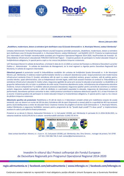 „Reabilitare, modernizare, dotare și extindere (prin desființare corp C2) Școala Gimnazială nr. 4, Municipiul Moreni, Județul Dâmbovița”