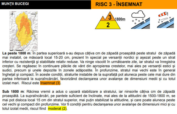 Risc însemnat, de gradul trei pe o scară de la unu la cinci, de producere de avalanşe la peste 1.800 de metri altitudine în masivele Făgăraş, Rodnei, Călimani-Bistriţei, Bucegi, Parâng Şureanu şi Ţarcu Godeanu.