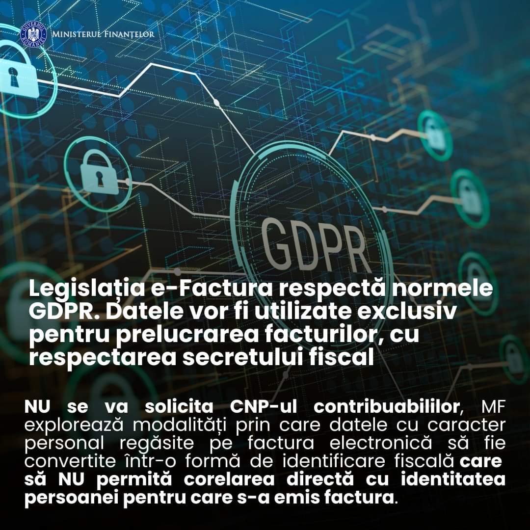 În acest moment, cu toate că în forma actuală legislația e-Factura respectă Regulamentul UE 2016/679 (GDPR), MF explorează modalități prin care datele cu caracter personal regăsite pe factura electronică să fie convertite într-o formă de identificare fiscală care să NU permită corelarea directă cu identitatea persoanei pentru care s-a emis factura.