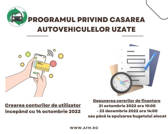 S-a amânat lansarea Programului privind casarea autovehiculelor uzate, în urma discuțiilor purtate cu asociațiile implicate în desfășurarea Programului privind casarea autovehiculelor uzate, pentru o derulare eficientă cu participarea cât mai multor unități administrativ-teritoriale, a reieșit necesitatea actualizării anumitor condiții, astfel că, la data prezentei, se lucrează la modificarea ghidului de finanțare aferent acestui program.