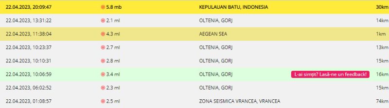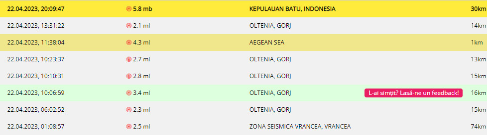Sâmbătă în România, VAL de CUREMURE, cinci în judeţul Gorj şi unul în Vrancea, potrivit informaţiilor publicate de Institutul Naţional de Cercetare – Dezvoltare pentru Fizica Pământului (INCDFP).