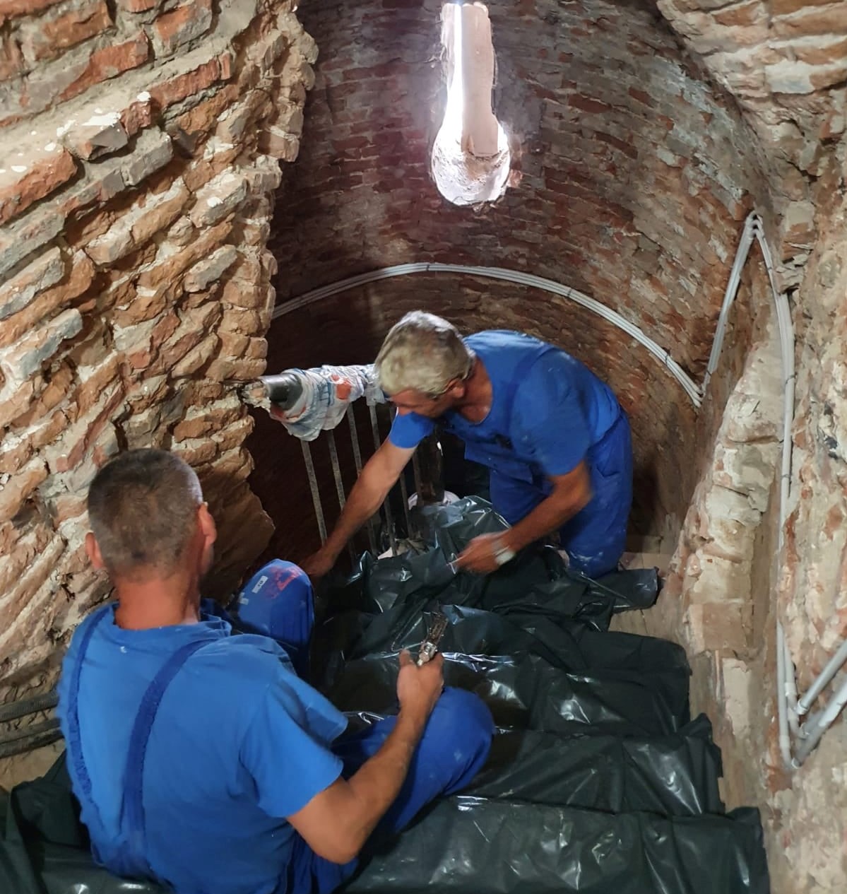 La exterior, se sablează zidăria turnului, acolo unde este nevoie se completează golurile de cărămidă și se continuă cu rostuirea zidăriei noi.