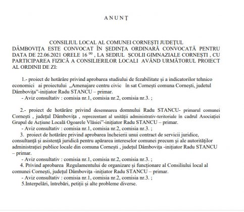 Facebook Twitter WhatsApp SEDINȚĂ CL Cornești, în data de 22.06.2021, LA SEDIUL ȘCOLII GIMNAZIALE CORNEȘTI , CU PARTICIPAREA FIZICĂ A CONSILIERILOR LOCALI AVÂND URMĂTORUL PROIECT AL ORDINII DE ZI: