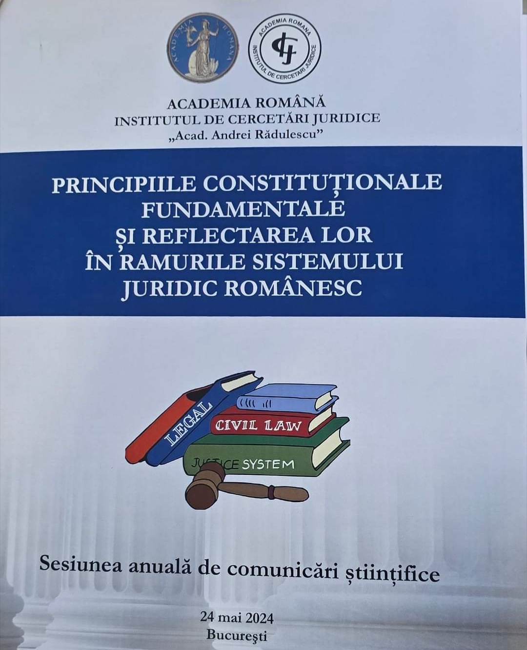 Sesiunea anuală de comunicări științifice a Institutului de Cercetări Juridice ”Acad. Andrei Rădulescu” al Academiei Române a adunat specialiști în drept pentru a discuta teme de actualitate, inclusiv reflectarea principiilor constituționale în sistemul juridic românesc. Conf univ.dr.Claudia Gilia a vorbit despre principiul supremației Constituției în cadrul evenimentului.