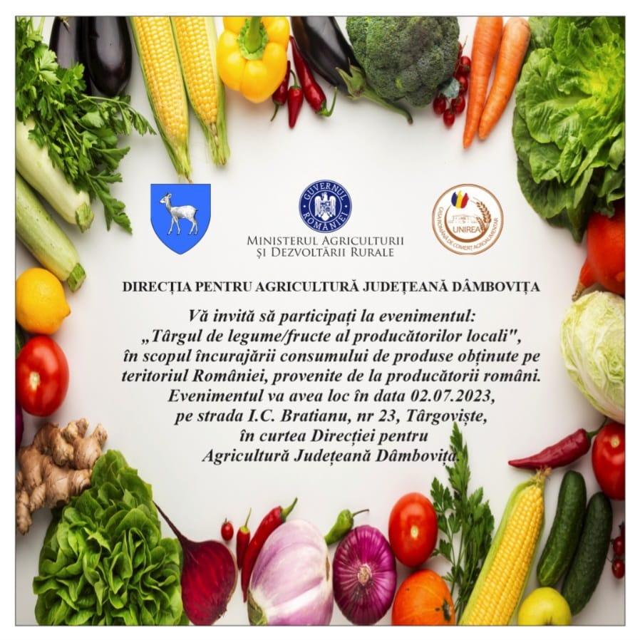 Târg de legume și fructe, 2 iulie 2023, începând cu ora 9:00,la Direcția pentru Agricultură Județeană Dâmbovița,producătorii vă așteaptă la cumpărături.