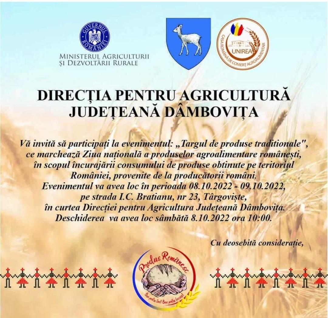 Târgul de produse tradiționale pe 8-9 octombrie, în curtea Direcției Agricole Dâmbovița,astfel, la nivelul județului Dâmbovița se sărbătoreşte Ziua Națională a produselor agroalimentare românești.