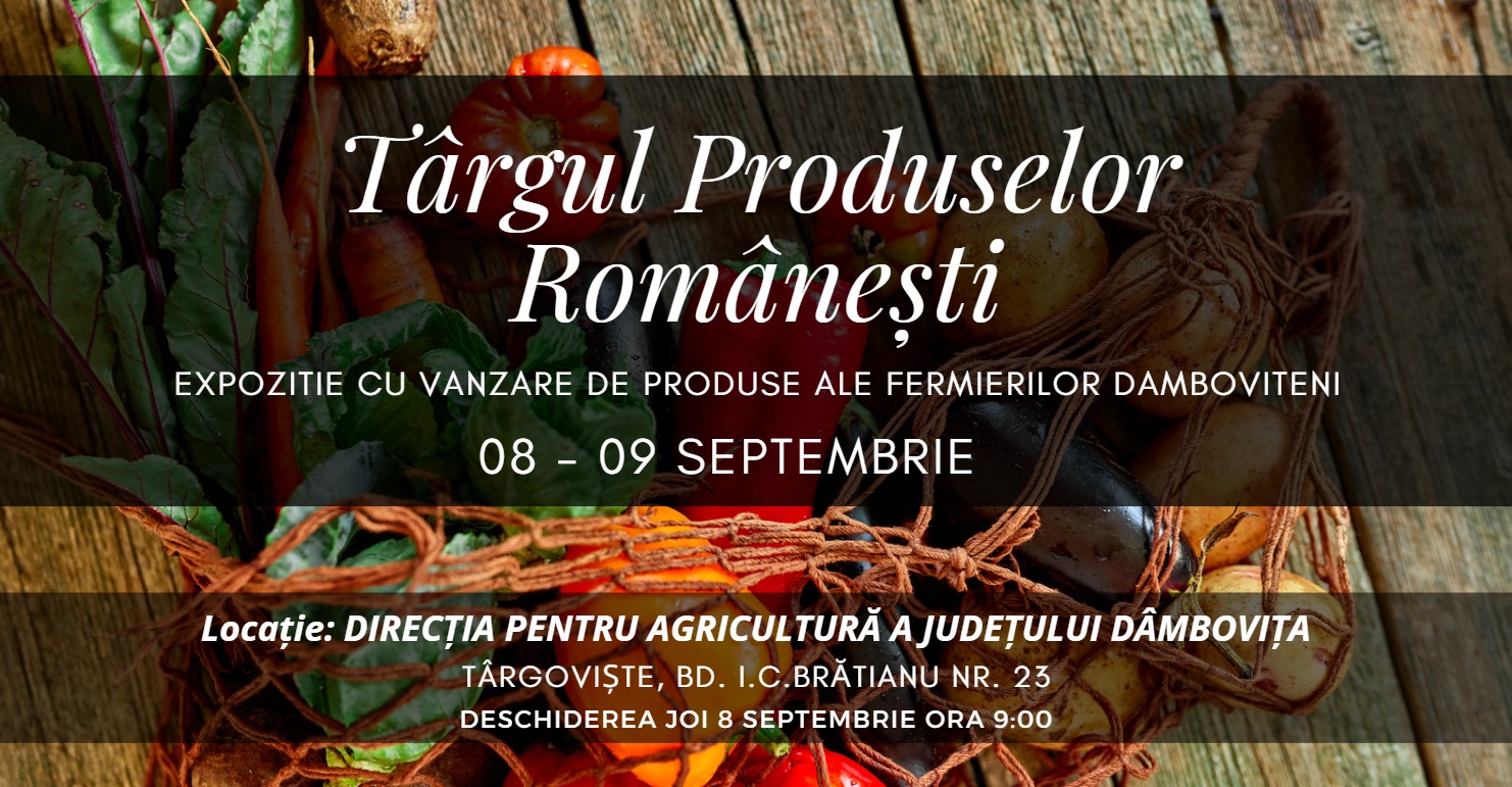 Târgul produsele românești, 8-9 septembrie, joi și vineri, micii producători din județul Dâmbovița își vor expune produsele în curtea Direcției Agricole Dâmbovița pentru a oferi tururor cetățenilor produse alimentare românești, sănătoase și gustoase!