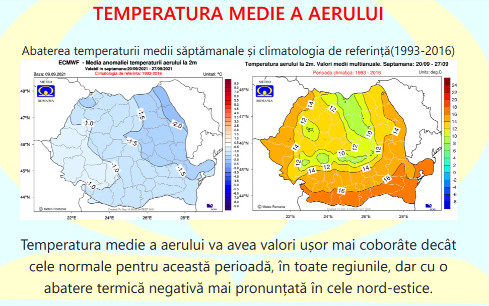 Temperatura medie a aerului va avea valori ușor mai coborâte decât cele normale pentru această perioadă, în toate regiunile, dar cu o abatere termică negativă mai pronunțată în cele nord-estice. Cantitățile de precipitații se vor situa în jurul celor normale pentru această săptămână, la nivelul întregii țări.