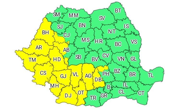 Notă: Astfel de fenomene vor fi pe arii restrânse și în restul teritoriului, cu o probabilitate mai ridicată în vestul Dobrogei și în sud-estul Munteniei.
