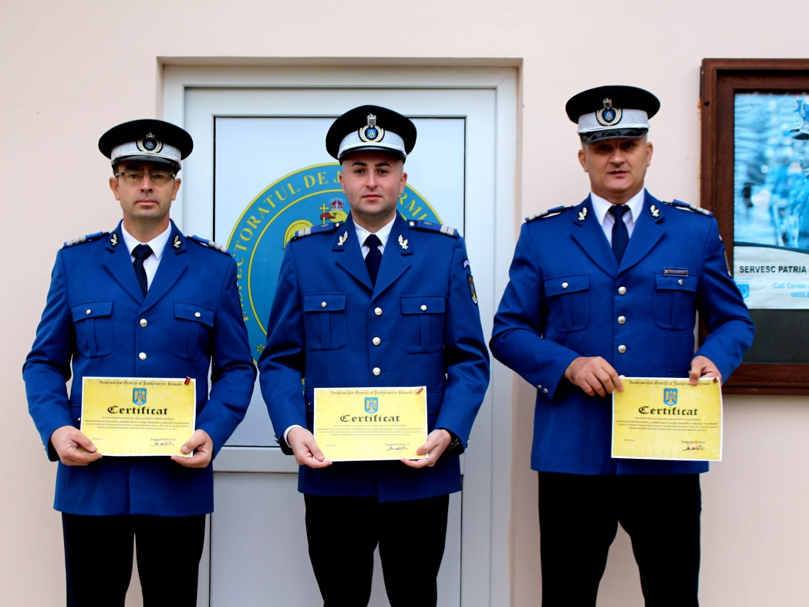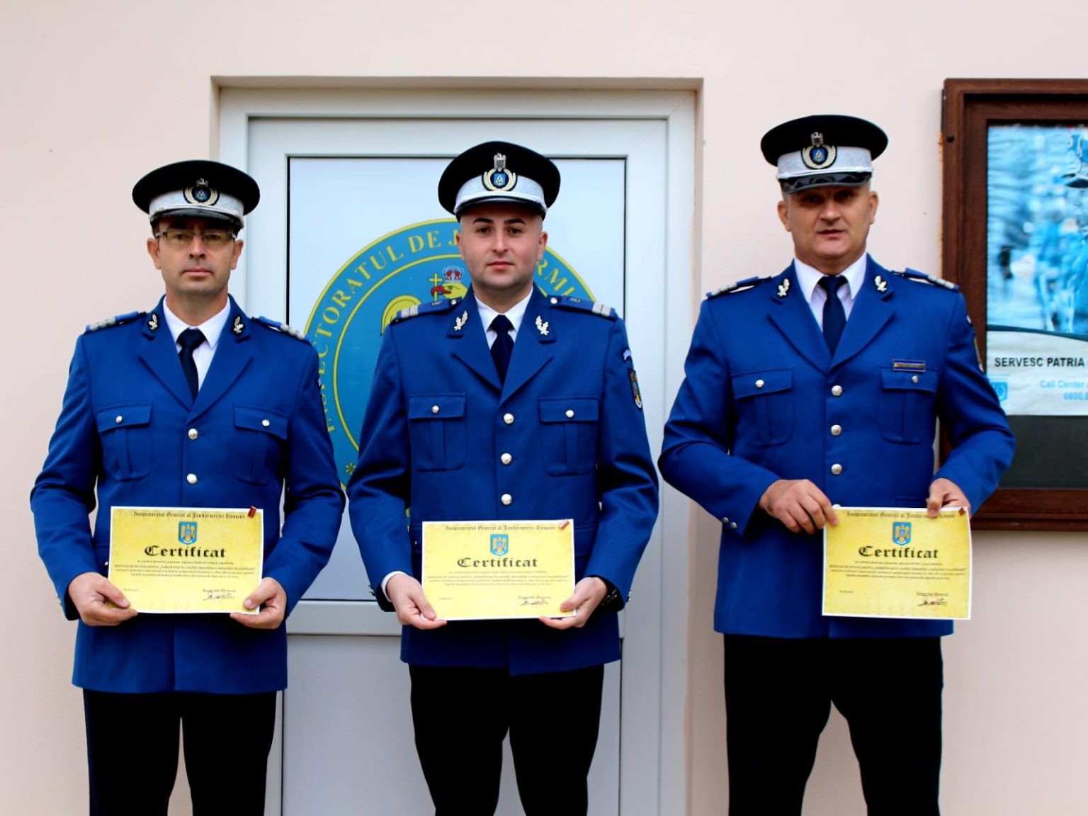 Trei jandarmi dâmbovițeni, recompensați cu Distincția de serviciu pentru ,,îndeplinirea în condiții deosebite a misiunilor încredințate”, plutonierul adjutant Petre Marian, plutonierul adjutant Vlad Ionuț-Valentin și plutonierul Radu Ionuț-Eusebiu