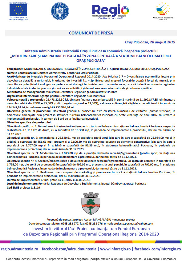 Unitatea Administrativ Teritorială Oraşul Pucioasa comunică începerea proiectului „MODERNIZARE ŞI AMENAJARE PEISAGERĂ ÎN ZONA CENTRALĂ A STAŢIUNII BALNEOCLIMATERICE