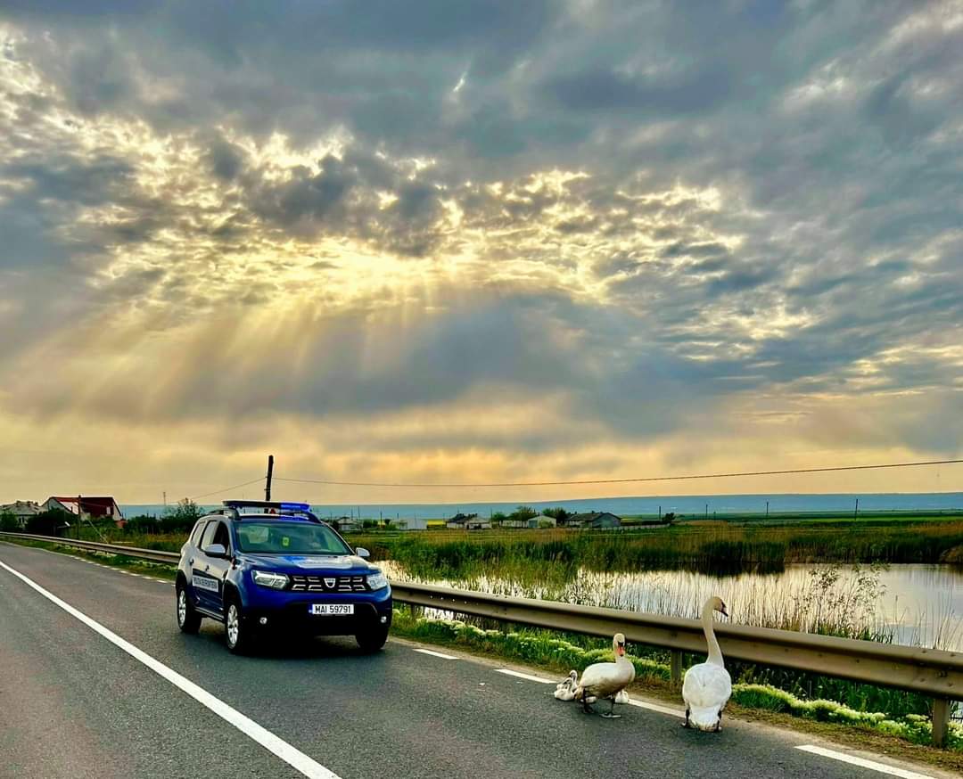 Unitatea unei familii de lebede ieșită matinal la plimbare pe carosabil a oferit momente magice polițiștilor care au oprit și s-au bucurat de moment, din plin.