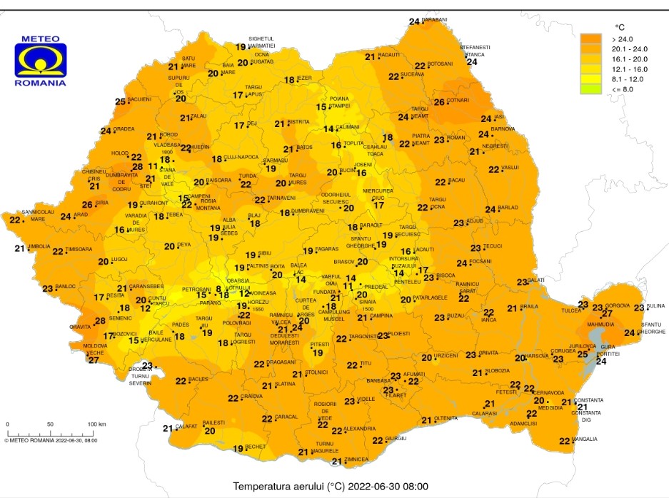 Astfel, vremea va fi în continuare mult mai caldă decât ar fi normal în această perioadă.Vom avea parte de temperaturi ridicate aproape în toată România. Indicele temperatură umezeală (ITU) va atinge pragul critic de 80 de unități, iar vântul va sufla slab și moderat.