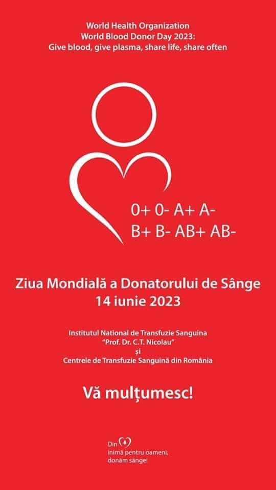 Ziua Mondială a Donatorului de Sânge, astăzi, se aduc mulțumiri și recunoștință tuturor celor care printr-un gest simplu dau o nouă șansă la viață unei persoane care are nevoie de transfuzie de sânge.