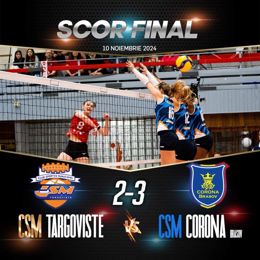 CSM Târgoviște a fost învinsă într-un meci extrem de echilibrat și emoționant în fața celor de la CSM Corona Brașov, scor final 2-3 (18-25; 18-25; 30-28; 25-20; 9-15). Deși echipa noastră a avut un început dificil, pierzând primele două seturi, fetele au demonstrat un caracter deosebit și au reușit să revină spectaculos, câștigând seturile 3 și 4 și forțând un decisiv. Din păcate, setul 5 a fost adjudecat de brașovence, iar victoria le-a revenit acestora.