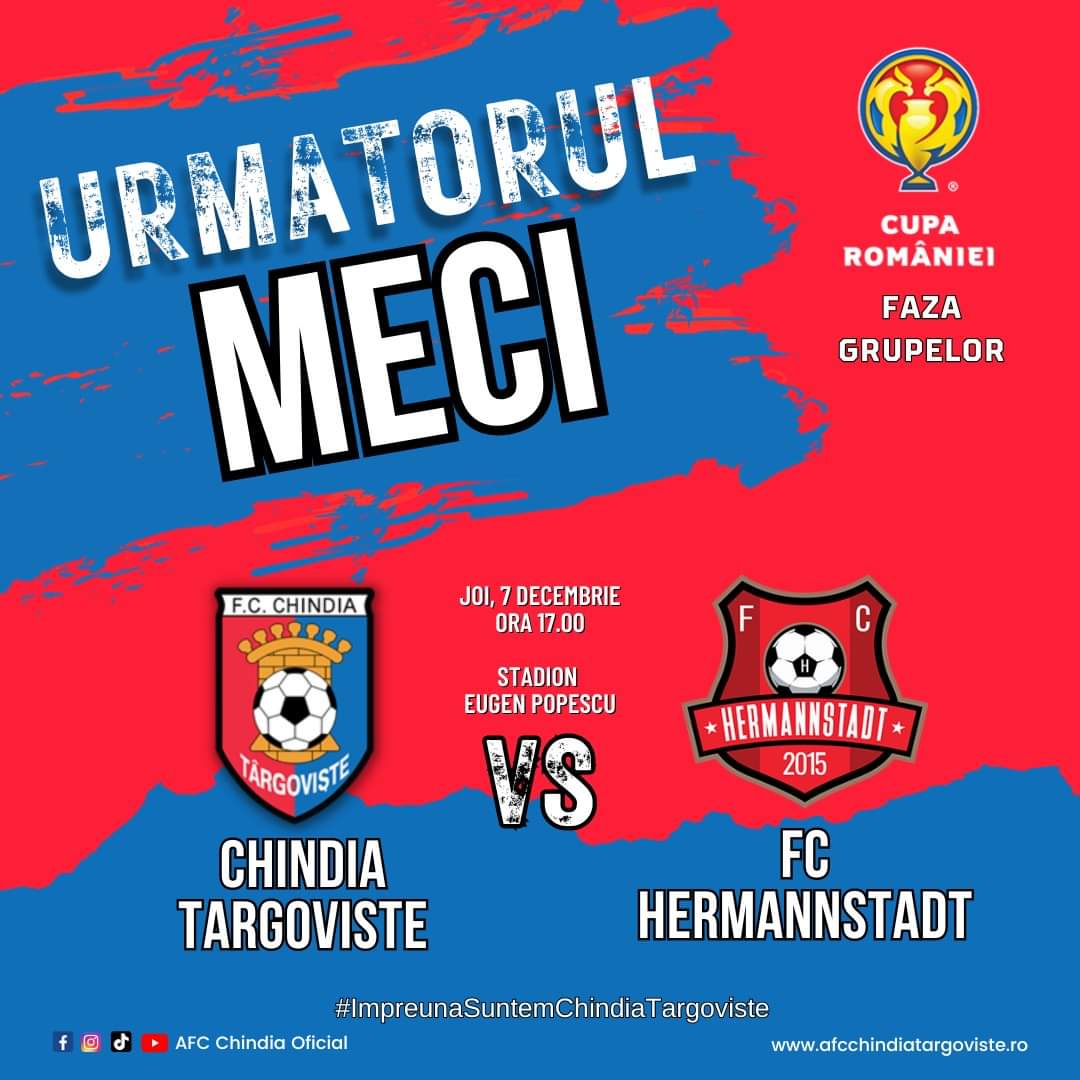 Nu ratați meciul din Cupa României – Grupe: Chindia Târgoviște – FC Hermannstadt, joi, 7 decembrie, ora 17:00, pe stadionul Eugen Popescu din Târgoviște