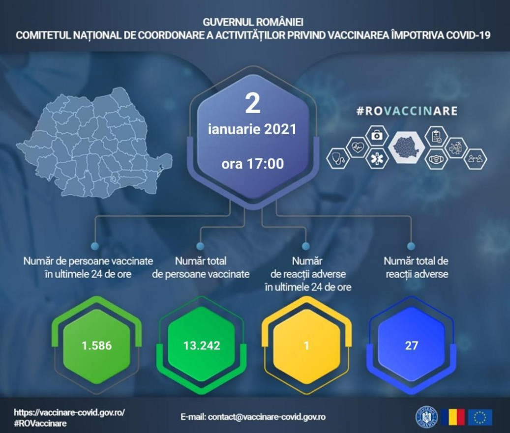 Potrivit datelor puse la dispoziția CNCAV de către Institutul Național de Sănătate Publică, prin aplicația Registrul Electronic Național al Vaccinărilor (RENV), care ține evidența vaccinărilor, situația din ziua de 2 ianuarie a.c., ora 17.00, este următoarea:
