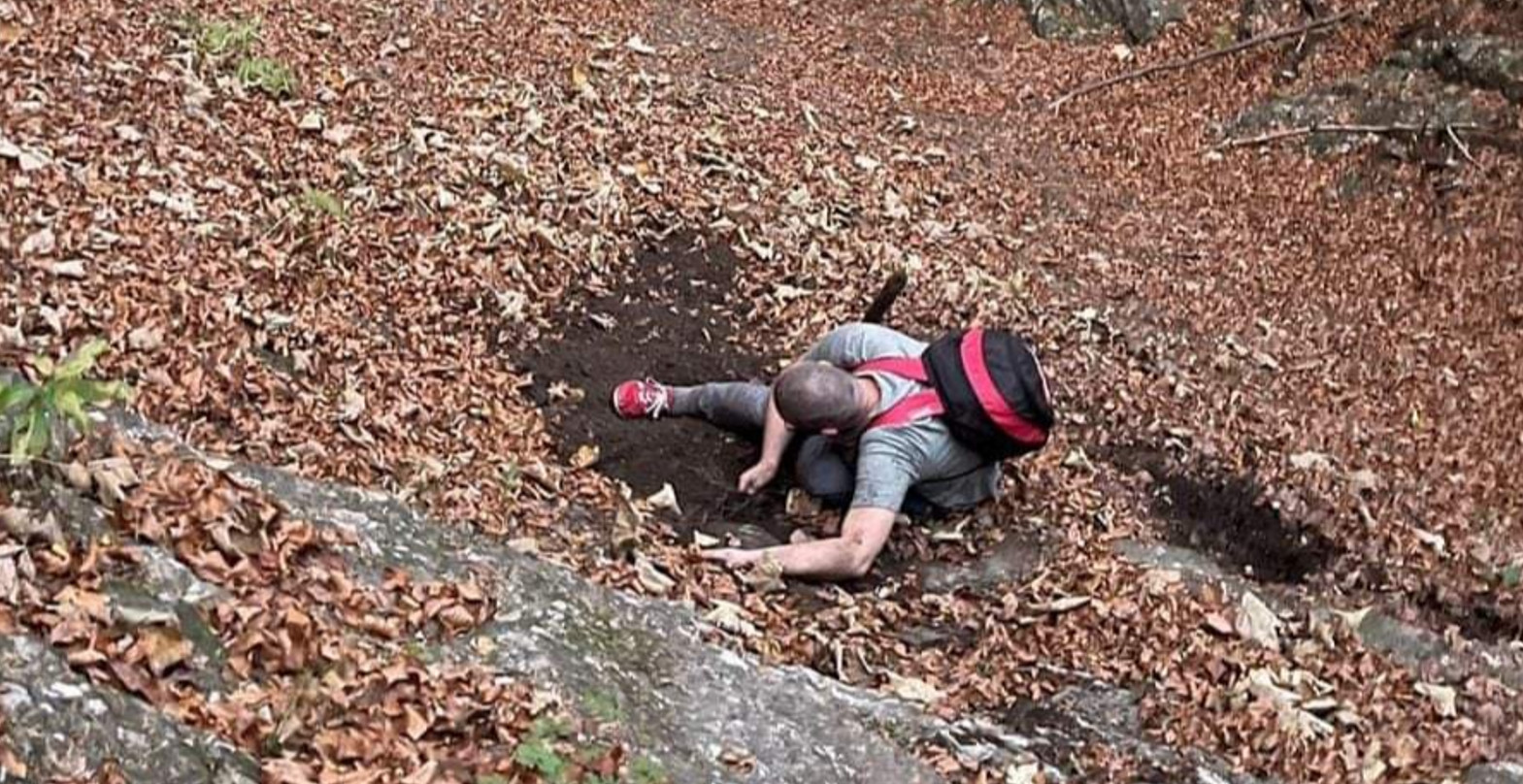 ” În prima parte a traseului bărbatul a alunecat și a căzut din potecă mai bine de 10 metri. Printr-o minune s-a oprit pe o pantă foarte înclinată, deasupra unei săritori de peste 20 de metri, de unde de-a lungul anilor, nu a scăpat nimeni cu viața.