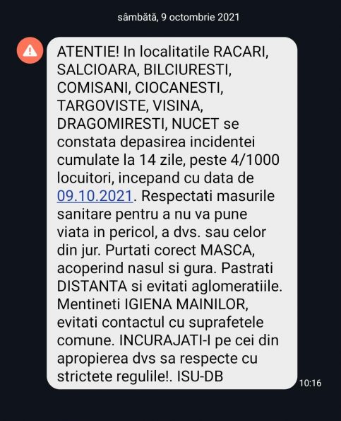 ALERTĂ SEVERĂ, RO-Alert a emis un mesaj de avertizare pentru Dâmbovița cu îndemn respectarea măsurilor sanitare