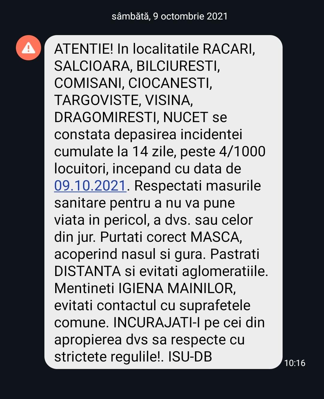 ALERTĂ SEVERĂ!RO-Alert a emis un mesaj de avertizare pentru Dâmbovița cu îndemn respectarea măsurilor sanitare