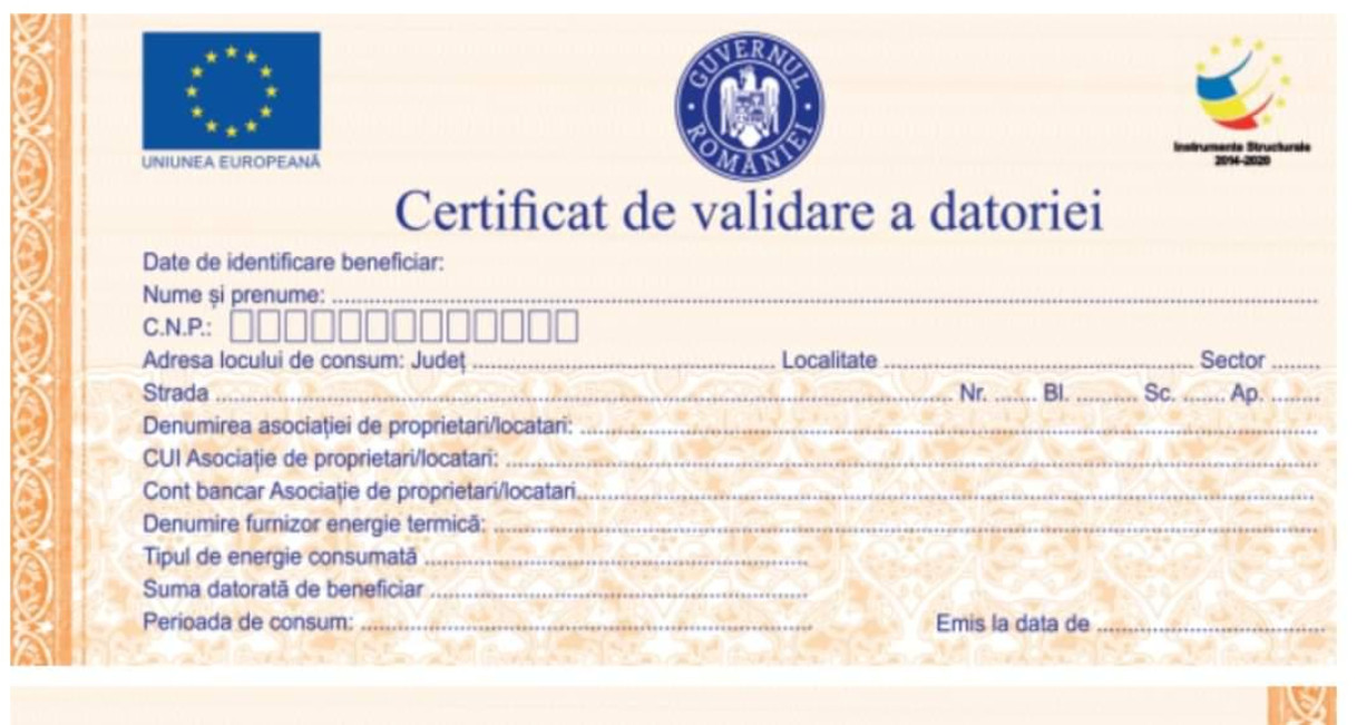 Vă reamintim că aceste certificate de validare a datoriilor se emit în două exemplare, din care un exemplar se păstrează la asociația de proprietari/ locatari emitentă iar cel de-al doilea exemplar se păstrează la Compania Naţională „Poşta Română” S.A, ca anexă la documentele care stau la baza plății prin serviciul de mandat poștal.