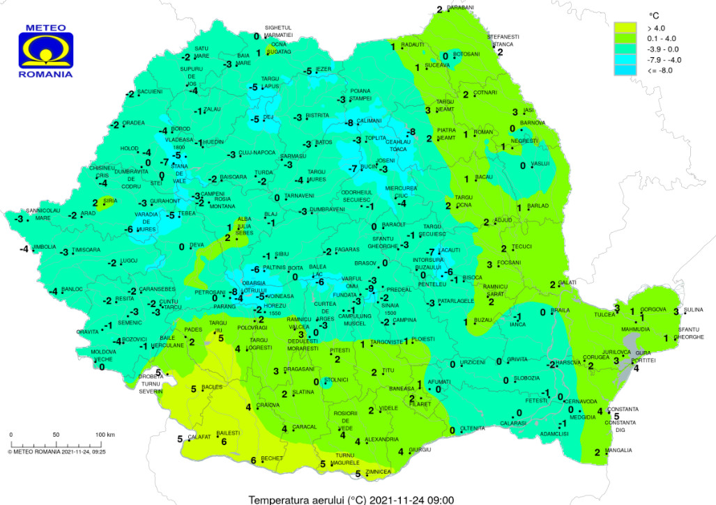 Vântul va sufla slab și moderat, cu unele intensificări noaptea în sudul Banatului și pe crestele Carpaților Meridionali. Temperaturile maxime se vor încadra între 3 și 10 grade, iar cele minime, în general, între -7 și 3 grade.