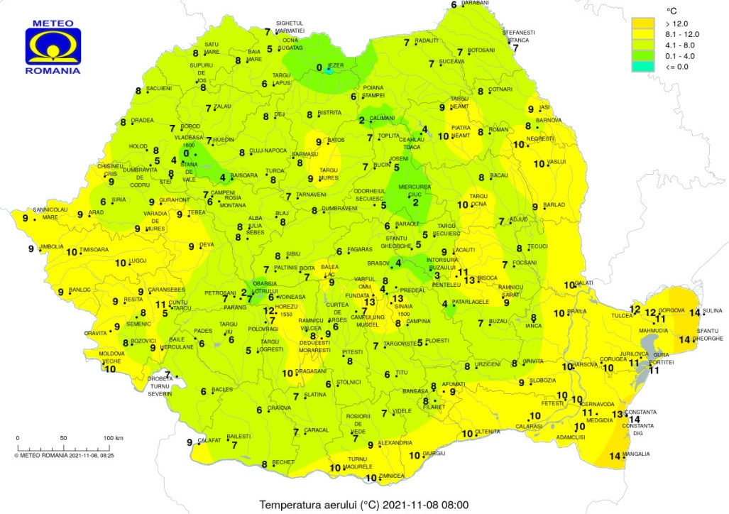 Astfel, temperaturile maxime se vor încadra între 8 şi 21 de grade, cele mai ridicate fiind în Muntenia şi Dobrogea. Cerul va fi mai mult noros în jumatatea nordică a ţării, unde va ploua pe arii relativ extinse şi va fi variabil în sud şi sud-est, unde ploile vor fi pe spaţii mici, cu precădere în zona de deal. Cantităţile de apă vor depăşi local 10…15 l/mp şi izolat 25…30 l/mp, cu o probabilitate mai mare în Banat, Transilvania şi la munte.
