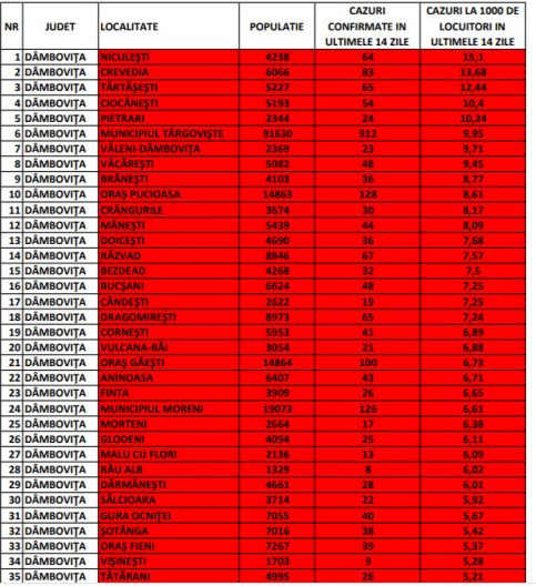 ATENȚIE DÂMBOVIȚENI, Rata de infectare crește rapid, ASTĂZI în DÂMBOVIȚA a ajuns la 6,14/1000, MUNICIPIUL TÂRGOVIȘTE a ajuns astăzi, la 9,95, de ieri de la 8,72, avem 68 de localități în SCENARIUL ROȘU.