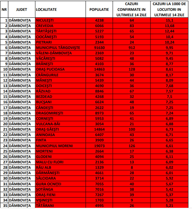 Vezi incidența pe fiecare localitate din Dâmbovița