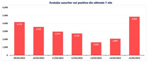 În ultimele 24 de ore au fost înregistrate 4.854 de cazuri noi de persoane infectate cu SARS – CoV – 2 (COVID– 19), cu 2.767 mai multe decât în ziua anterioară. 595 dintre cazurile noi din 24 de ore sunt ale unor pacienți reinfectați, testați pozitiv la o perioadă mai mare de 90 de zile după prima infectare.